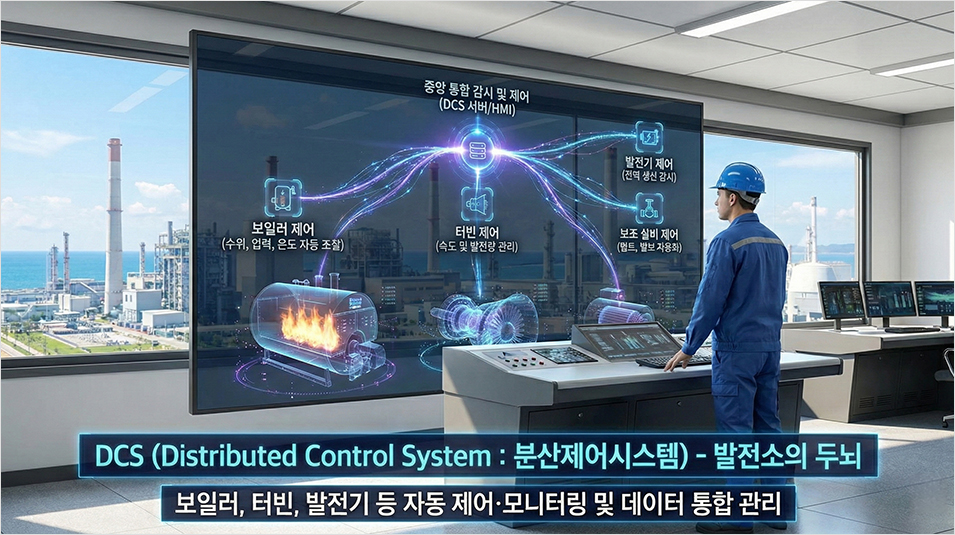 DCS(분산제어시스템)는 발전소의 심장부인 보일러, 터빈, 발전기 및 각종 보조 설비를 완벽하게 제어하고 감시하는 대규모 플랜트 통합 운영 시스템입니다.