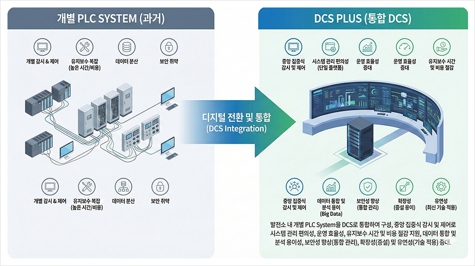 DCS Plus는 발전소 내에 산재해 있는 개별 PLC(Programmable Logic Controller) 시스템들을 단일 DCS 플랫폼으로 완벽하게 통합하는 고도화 솔루션입니다.